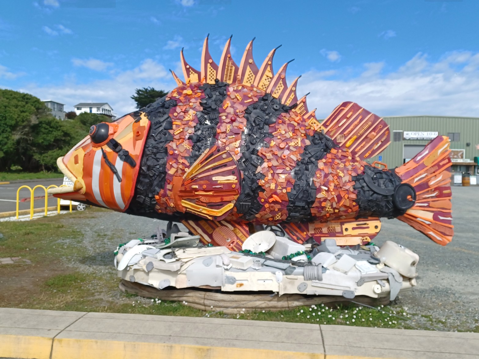 At the far end of the parking lot, in front of an operational fish market and cannery is a piece you truly need to take a camp chair to enjoy. The last time we were there it was a humongous rockfish. It sparkled like a mosaic of glass worth millions, and I wondered how Bandon dared to leave this truly magnificent piece unprotected in the middle of a parking lot. As I got closer, I began to recognize various pieces for what they truly were: trash, collected along the ocean shore and repurposed in a mind-altering way. Built by the town and the people who visit there, it reminds us all of the tragedy of the sea. Trash is collected by beachcombers and taken to a warehouse in the center of Old Town. There, it is cleaned, sorted, placed and painted. Anyone can work on it when the warehouse is open. Small pieces can be crafted and taken with you, or you can work on the next masterpiece for the public to enjoy.
